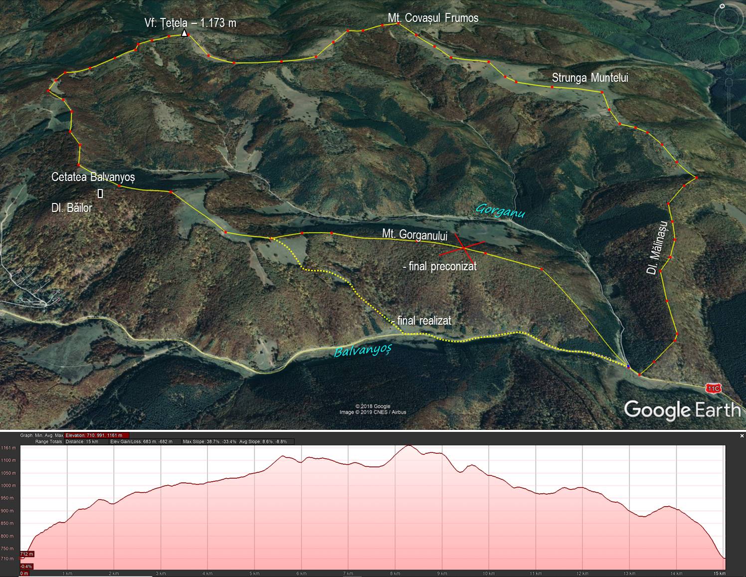 Traseu: Balvanyoș (Gura Gorganului) – Dl. Mălinașu – Strunga Muntelui – Mt. Covașu Frumos – Vf. Tețela – Dl. Băilor (Cetatea Balvanyoș) – Mt. Gorganu – Gura Gorganului