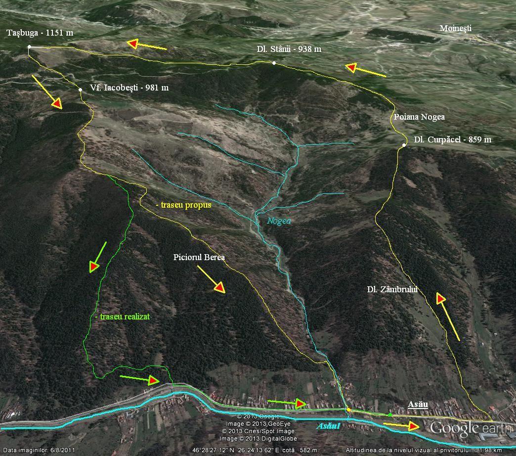 – traseu: Apa Asău (gura Zâmbrului) – Dl. Zâmbrului – Dl. Curpăcel – Poiana Nogea – Dl. Stânei – Vf. Taşbuga – Dl. Iacobeşti – Piciorul Berea – gura Nogei