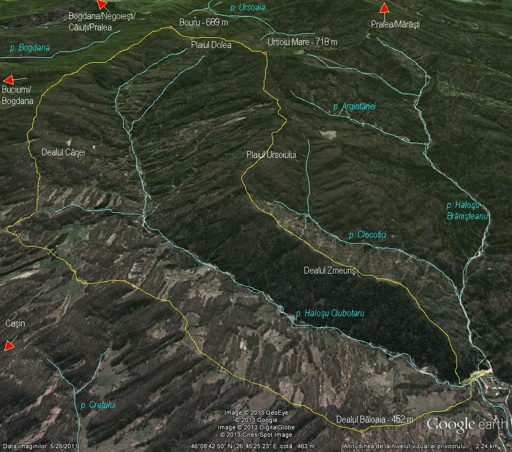 – traseu: Haloş – Dl. Zmeuriş – Vf. Ursoiu Mare – Vf. Bourul – Dl. Cârjei – Haloş