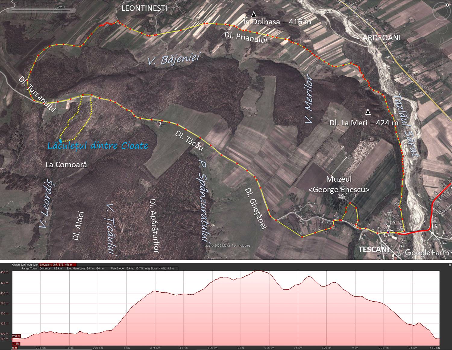 Traseu: TESCANI – Valea Tazlăului Sărat – Gura Băjeniei – Dl. Prianului – Dl. Țurcanului – Valea Leordiș – Lăculețul dintre Cioate – Dl. Tâcău – Dl. Ghețăriei – TESCANI