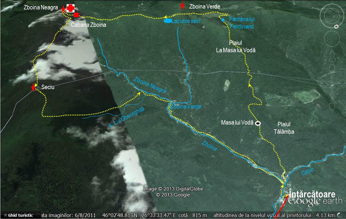 – traseu: Înțărcătoare – Plaiul Tălâmba – Masa lui Vodă – Plaiul La Masa lui Vodă – Mt. Zboina Verde – Poiana La Lacuri – Cabana Zboina – Vf. Zboina Neagră – Vf. Seciului – Plaiul Seciului – P. lui Gheorghiță – Valea Zboina Neagră – Înțărcătoare