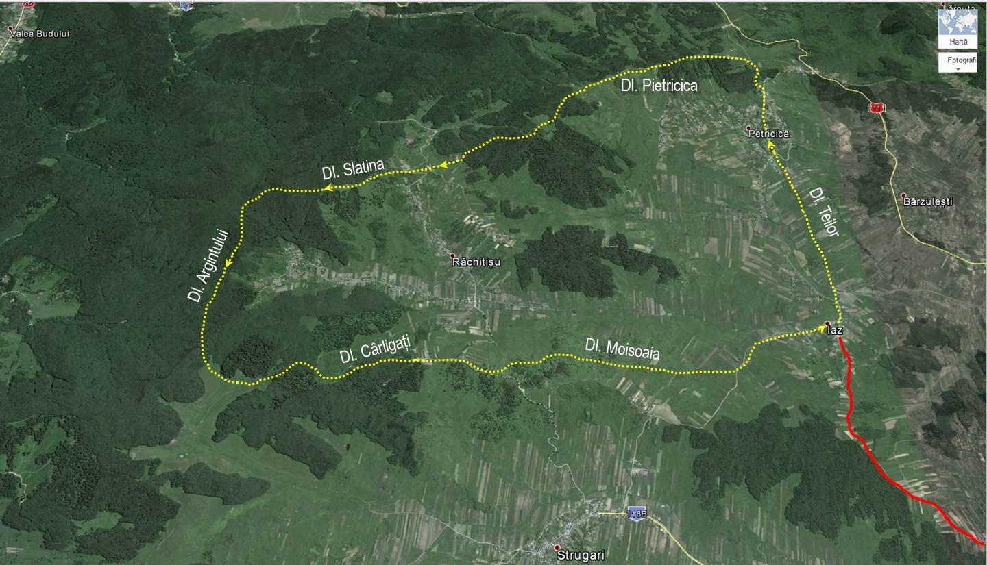 Traseu: Iaz – Dl. Teiului – Culmea Pietricica Dl. Slatina Dl. Argintului Dl. Cârligați Dl. Moisoaia – Iaz