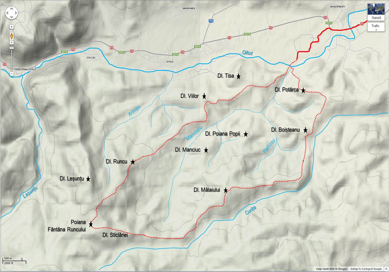 Traseu: Bogdănești – Dl. Viilor – Dl. Runcu – Dl. Arșiței – Dl. Mălaiului – Dl. Boișteanu – Dl. Todoscanu – Bogdănești