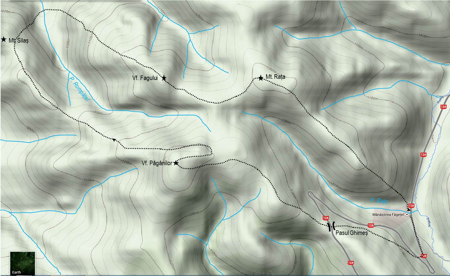 Traseu: M-rea Făgețel – Pasul Ghimeș – Mt. Păgânilor – Mt. Silaș – Valea Rompățel – Mt. Fagului – Mt. Rața – M-rea Făgețel