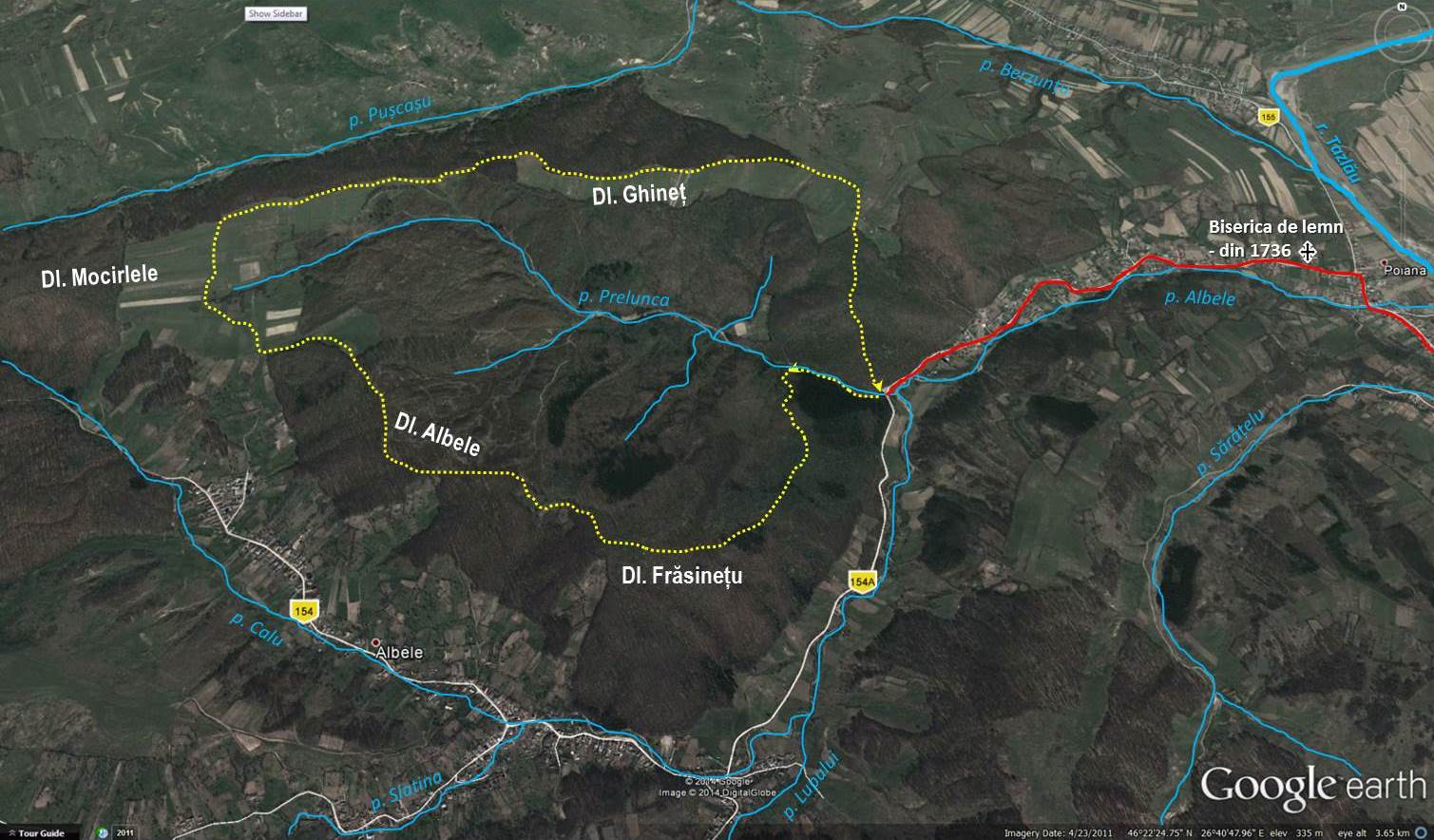 Traseu: Poiana (gura Preluncăi) – Dl. Frăsinețu – Dl. Albele – Dl. Mocirle – Dl. Ghineț – gura Preluncăi – Poiana [biserica de lemn din 1736]