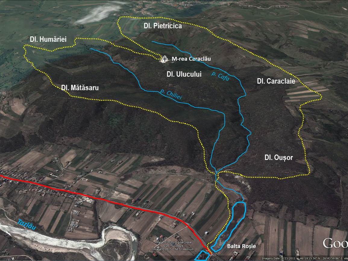 Traseu: Balta Roșie (Brătila) – Dl. Oușor – Dl. Caraclaie – Dl. Pietricica – Dl. Ulucului (M-rea Caraclău) – Dl. Humăriei – Dl. Mătăsarului – Balta Roșie