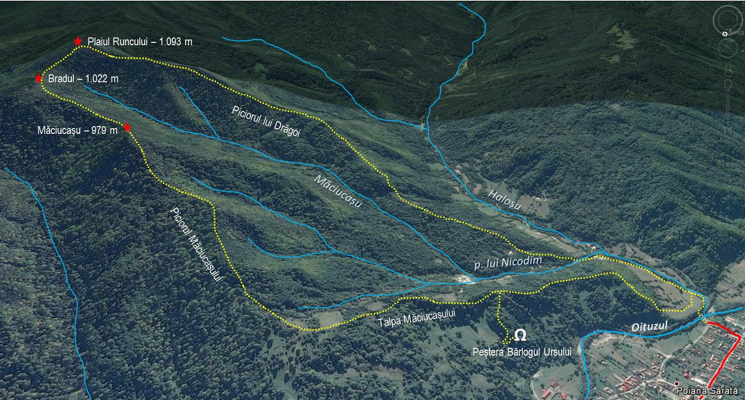 Traseu: Poiana Sărată (Gura Haloșului) – Talpa Măciucașului [Peștera Bârlogul Ursului]- Piciorul Măciucașului – Vf. Măciucașu – Vf. Bradului – Vf. Plaiul Runcului – Piciorul lui Drăgoi – Gura Haloșului