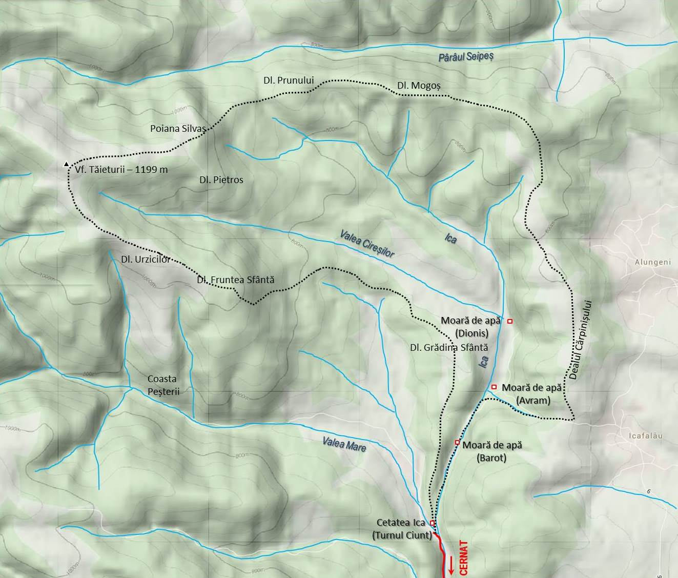 Traseu: Cetatea Ica – Grădina Sfântă – Dl. Fruntea Sfântă – Dl. Urzicilor – Vf. Tăieturii – Dl. Prunului – Dl. Cărpinișului – Valea Ica [morile de apă]