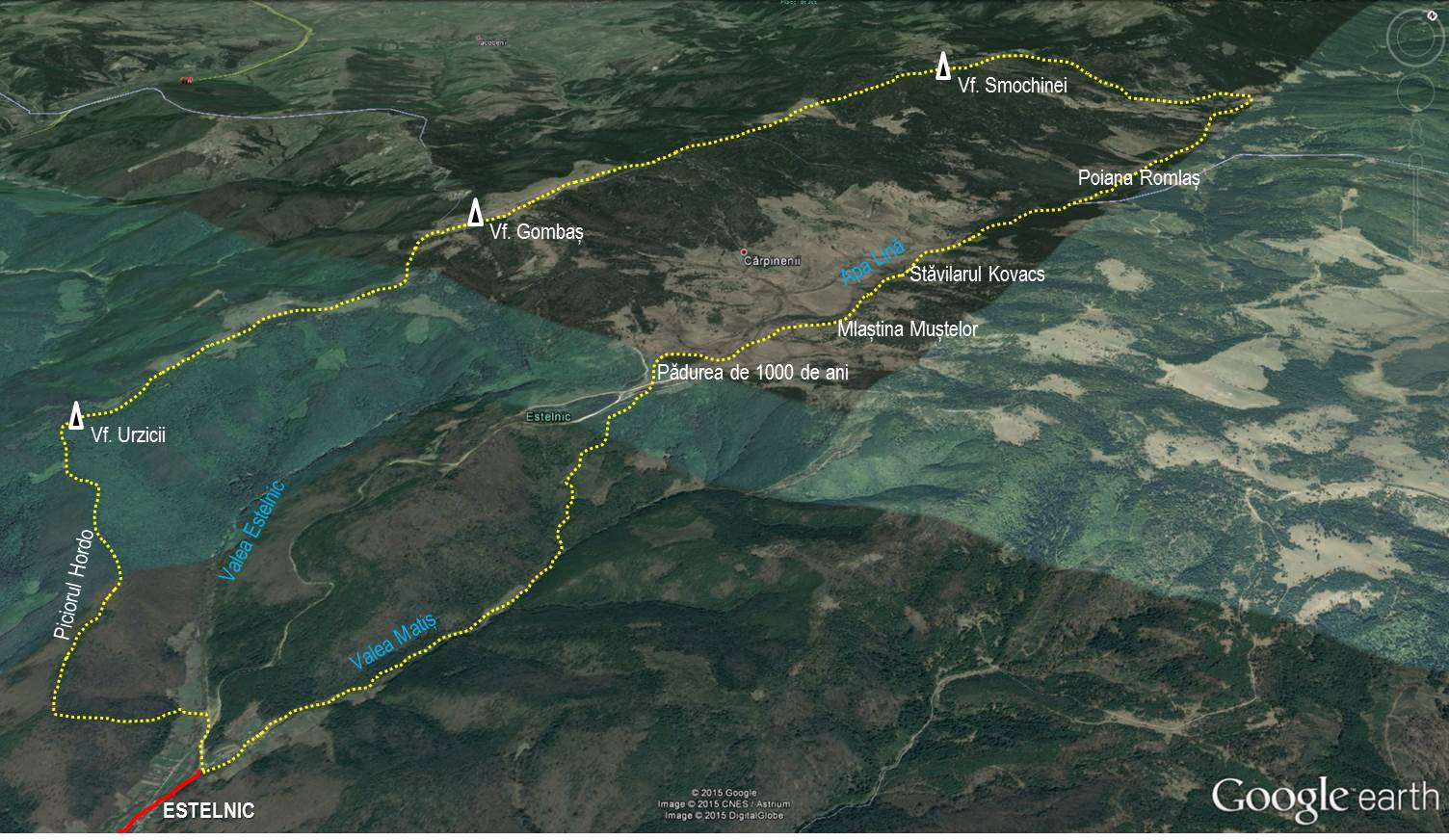Traseu: Estelnic (gura Matișului) – Valea Matișului – Pasul Cărpineni – Mlaștinile de pe Valea Lină – Vf. Smochinei – Vf. Gombaș – Vf. Urzicii – Piciorul Hordo – gura Matișului
