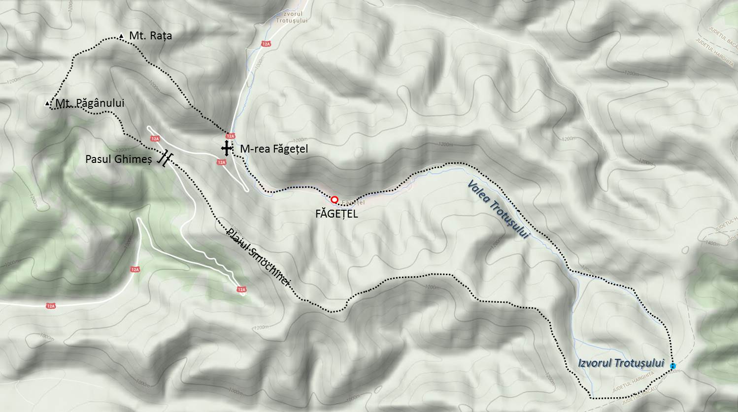 Traseu: M-rea Făgețel – Valea Trotușului – Izvorul Trotușului – Plaiul Smochinei – Pasul Ghimeș – Vârful Păgânul – Vf. Rața – M-rea Făgețel