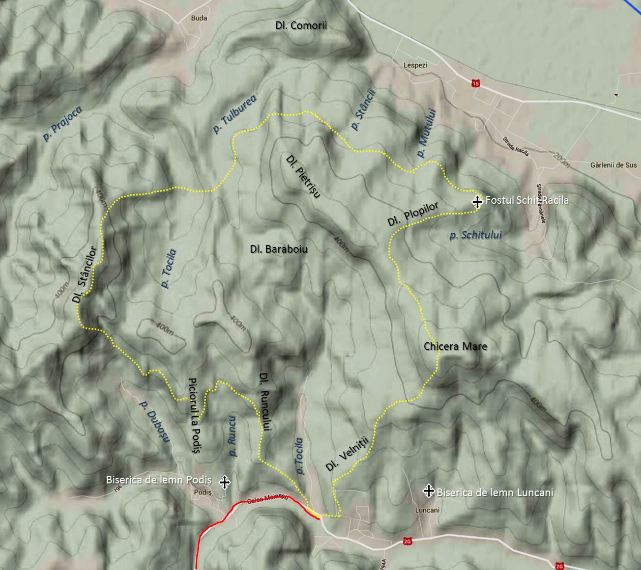 Traseu: Luncani – Dl. Runcu – Dl. La Podiș – Dl. Stâncilor – Valea Tocila – Valea Tulburea – Valea Stâncii – Fostul Schit Racila – Dl. Plopilor – Dl. Chicera Mare – Dl. Velniții – Luncani