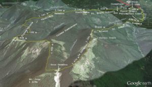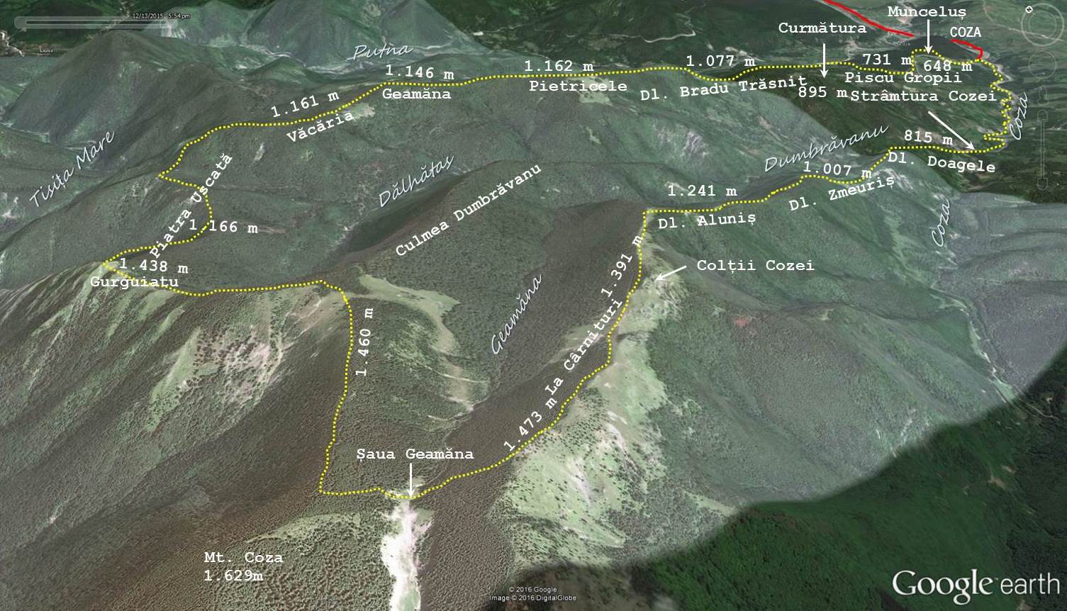 Traseu: Coza – Valea Cozei – Strâmtura Cozei – Dl. Doagele – Dl. Zmeuriș – Dl. Aluniș – Plaiul Cârmituri – Șaua Gemăna – Mt. Coza – Stânca Gurguiata – Piatra Uscată – Plaiul Văcăria – Mt. Geamăna – Dl. Pietricele – Dl. Bradul Trăsnit – Piscul Curmătura – Piscul Gropii – Dl. Munceluș – Coza