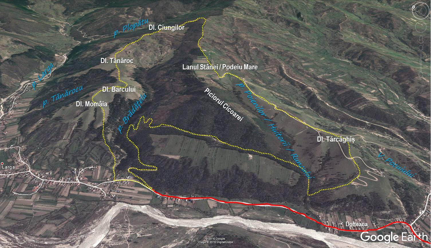 Traseu: Larga (Gura Brădățelului) – Piciorul Cicoarei – Valea Poienilor – Dl. Tărcăghiș – Podeiu Mare – Dl. Ciungilor- Dl. Tănăroc – Dl. Momâia – Gura Brădățelului.