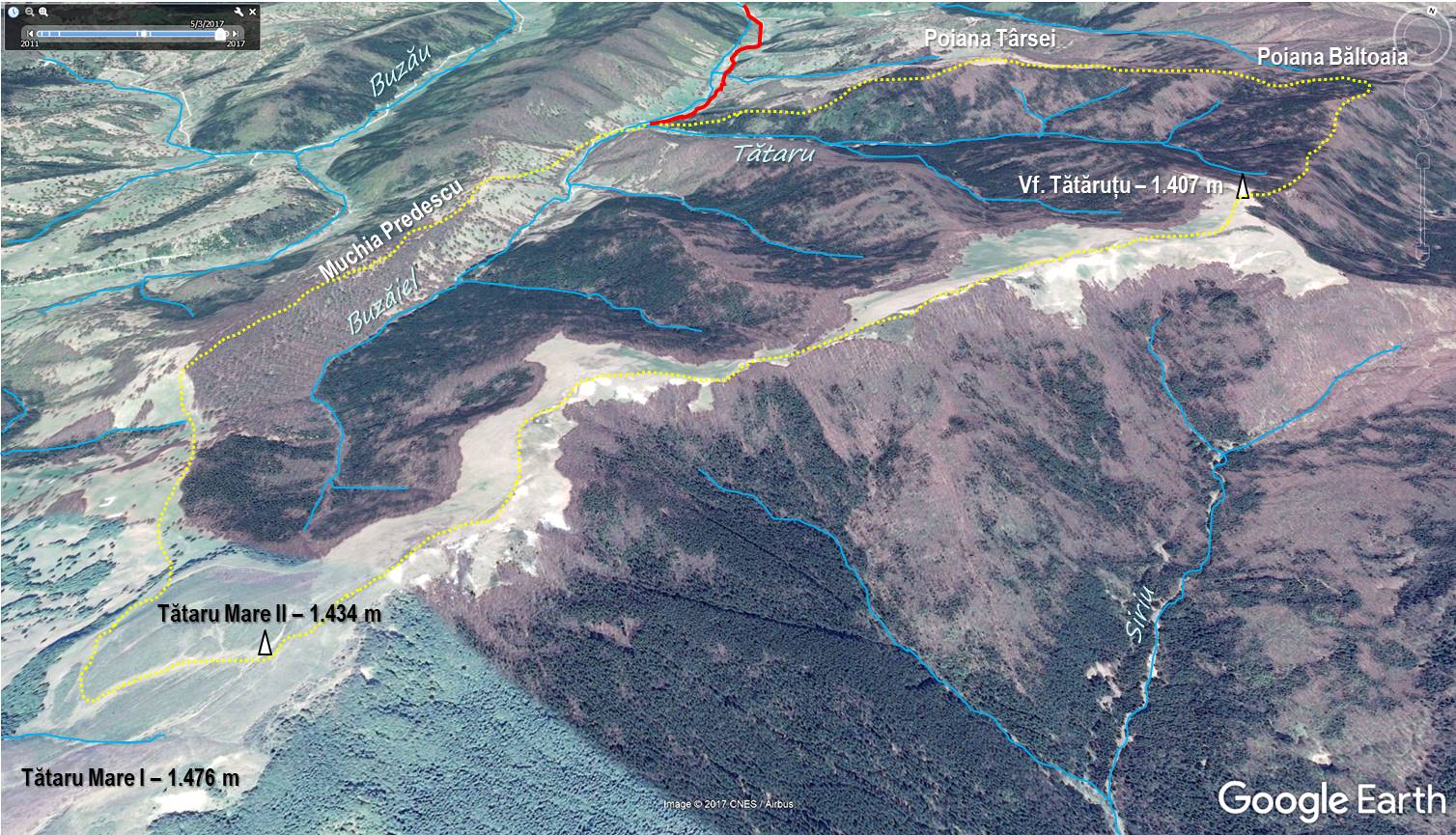 Traseu: Buzăiel (Gura Tătarului) – Muchia Predescu – Mt. Tătaru Mare – Mt. Tătăruțu – Poiana Băltoaia – Poiana Târsei – Gura Tătarului