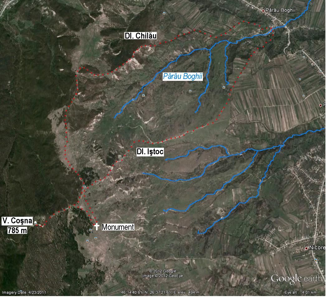Dealul Coşna (vârful şi “crucea eroilor”) – Dealul Iştoc – Pârâu Boghii