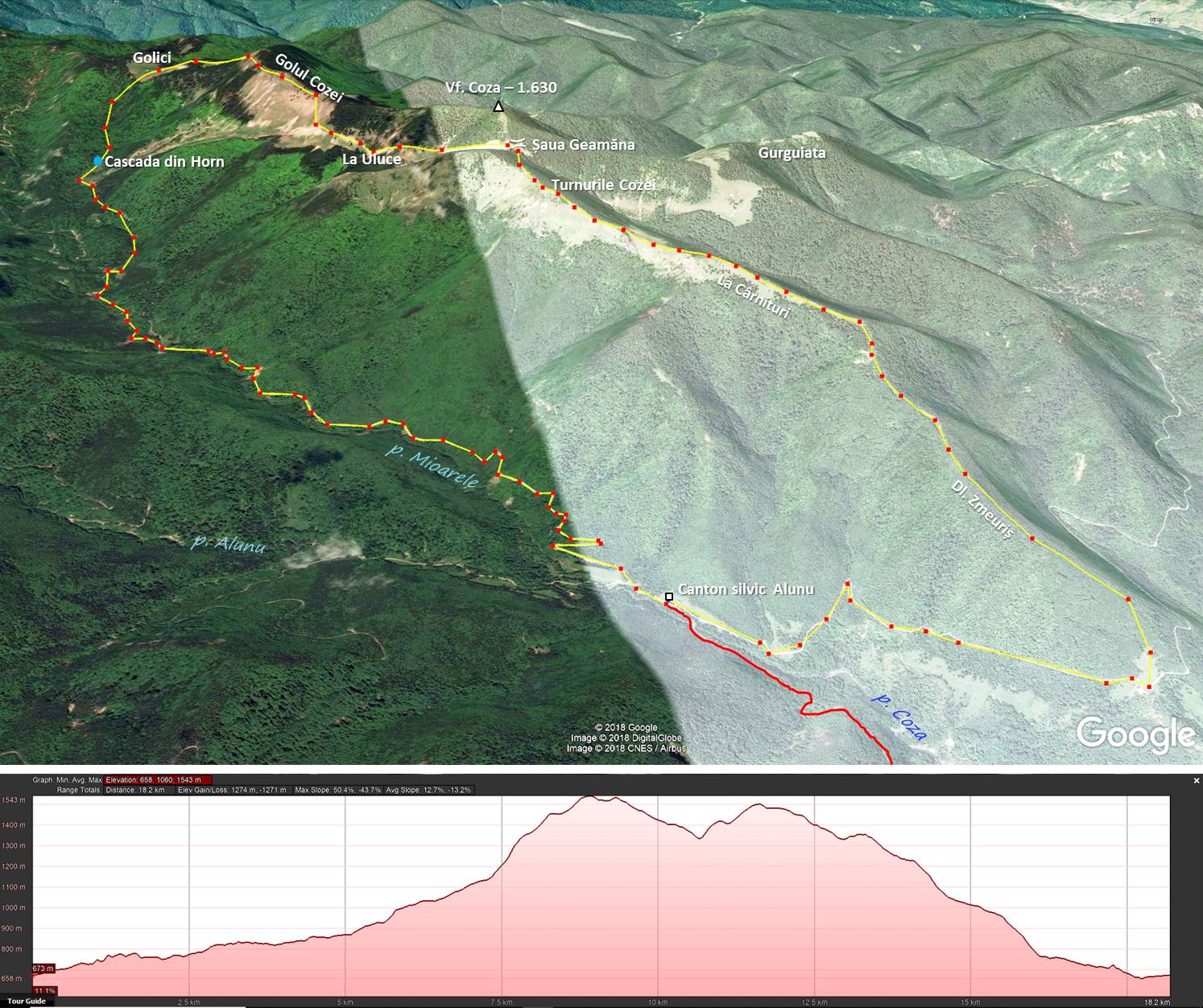 Traseu: Canton Alunu – Valea Mioarelor – Cascada din Horn – Golici – Golul Cozei – La Uluce – Șaua Geamăna – La Cârnituri – Dl. Zmeuriș – Canton Alunu