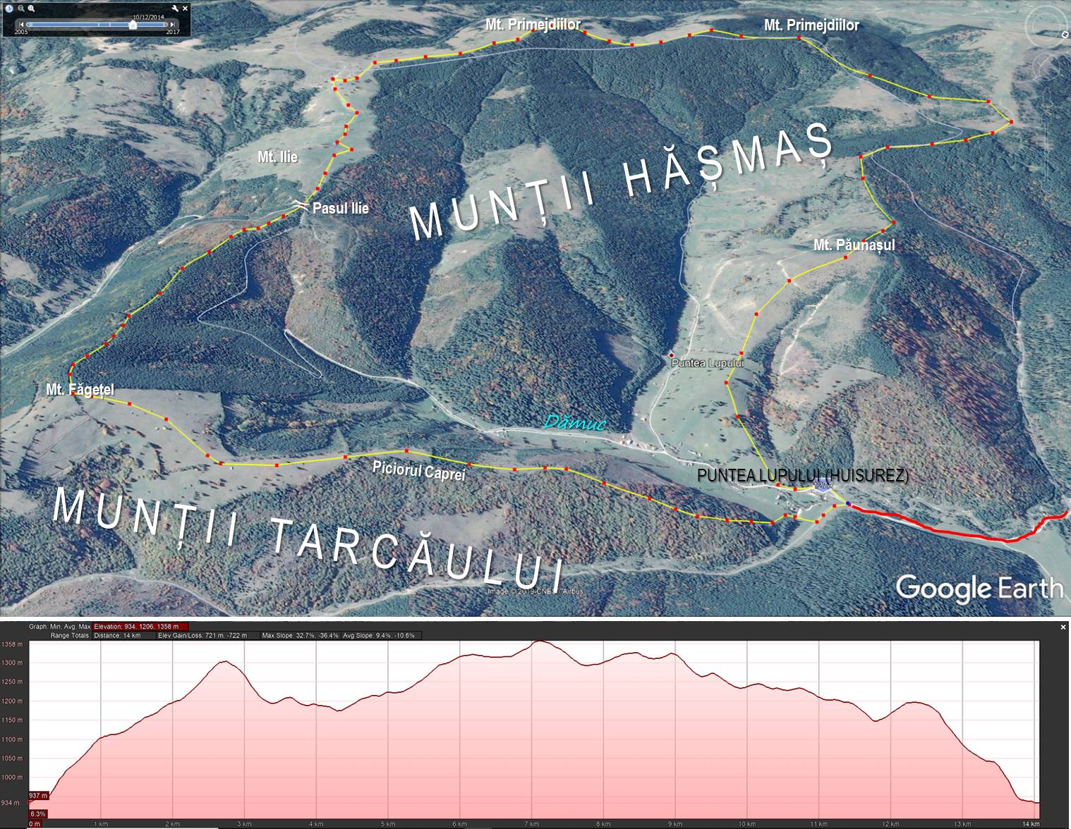 Traseu: Puntea Lupului – Piciorul Caprei – Mt. Făgețel – Mt. Ilie – Mt. Primejdiilor – Mt. Păunașu – Puntea Lupului