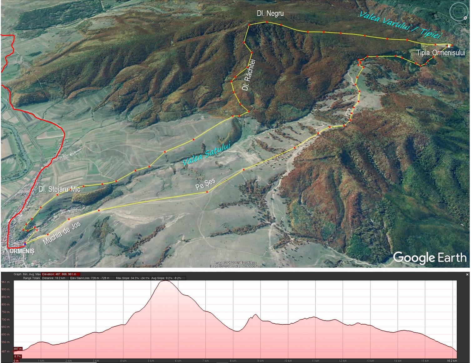 Traseu: ORMENIȘ – Dl. Stejaru Mic – Dl. Răchitei – Dl. Negru – Tipia Ormenișului – Pe Șes – Muchia de Jos – ORMENIȘ