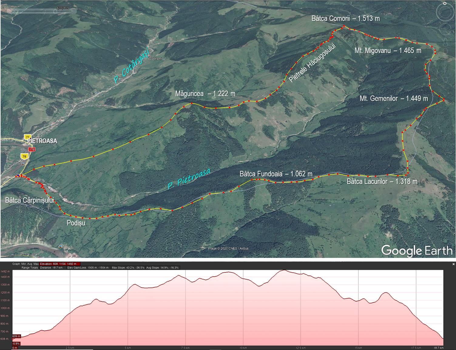 Traseu: Pietroasa (Gura Pietroasei) – Pe Podiș – Bâtca Fundoaia – Bâtca Lacurilor – Vf. Gemenii – Vf. Migovanu – Bâtca Comorilor – Pietrele Hăciugosului – Măguricea – Gura Pietroasei