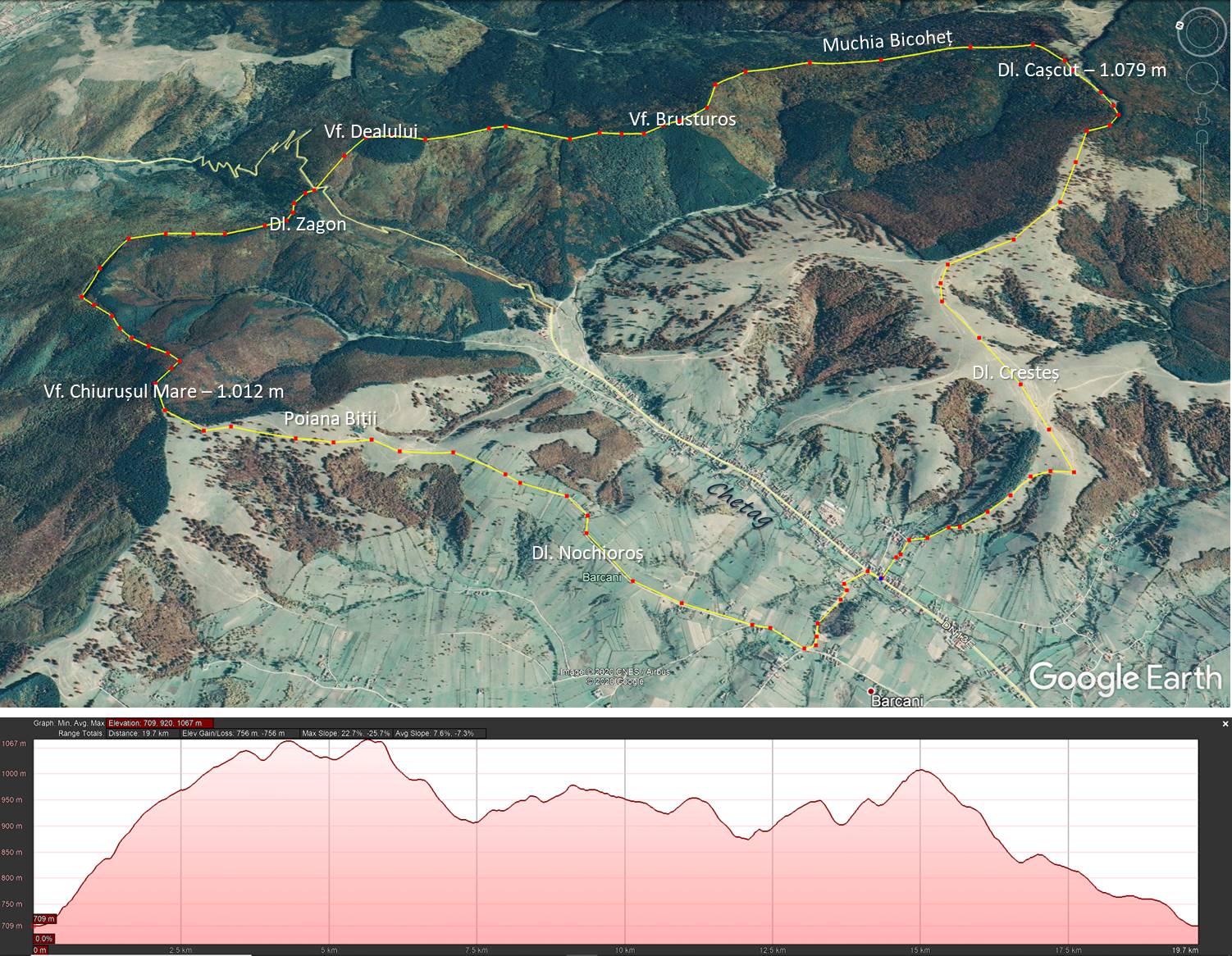 Traseu: Barcani – Dl. Cresteș – Dl. Cașcut – Muchia Bicoheț – Vf. Brusturos – Vf. Dealului – Dl. Zagon – Vf. Chiurușul Mare – Poiana Biții – Dl. Nochioroș – Barcani