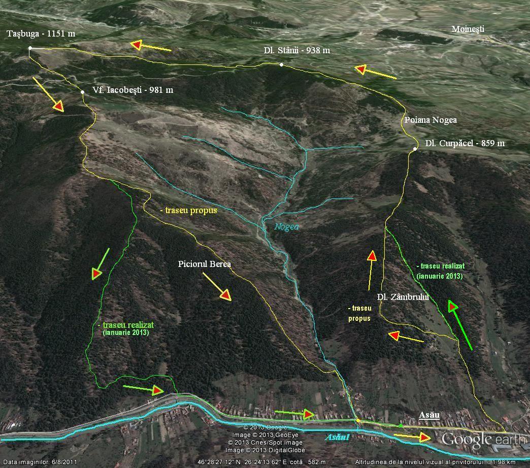 Traseu: Asău – Dl. Curpăcel – Poiana Nogea – Dl. Stânei – Vf. Taşbuga – Dl. Iacobeşti – Piciorul Berea – Asău