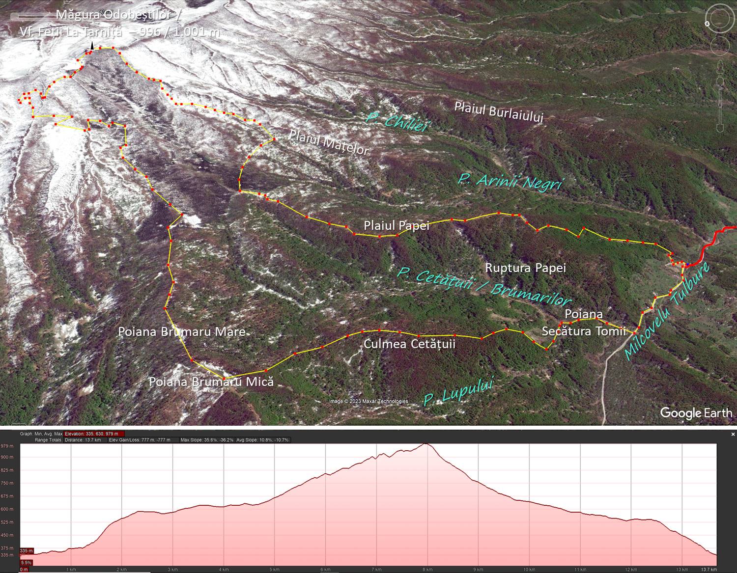 Traseu: Milcovel (Gura pârâului Arinii Negri) – Pârâul Cetățuii – Culmea Cetățuii – Plaiul Măgurii (Poienile Brumarului) – Vf. Măgura Odobeștilor – Plaiul Mâțelor – Plaiul Papei – Gura pârâului Arinii Negri