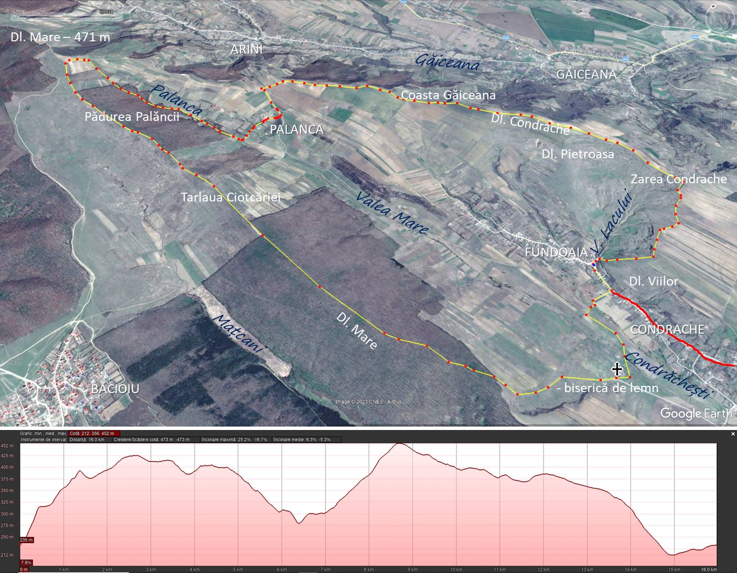 Traseu: FUNDOAIA (Gura Lacului) – Dl. Viilor – Zarea Condrache – Dl. Condrache – PALANCA – Valea Palanca – Dl. Mare – Pădurea Palanca – Dl. Mare – Biserica de lemn Fundoaia – FUNDOIA