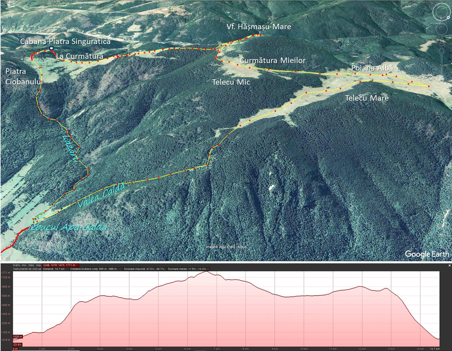Traseu: Izbucul Apa Caldă – Valea Lazăru – Sub Piatra Ciobanului – Cabana Piatra Singuratică – La Curmătură – Vf. Hășmașu Mare – Poiana Albă – Sub Telecu Mare – Valea Caldă – Izbucul Apa Caldă