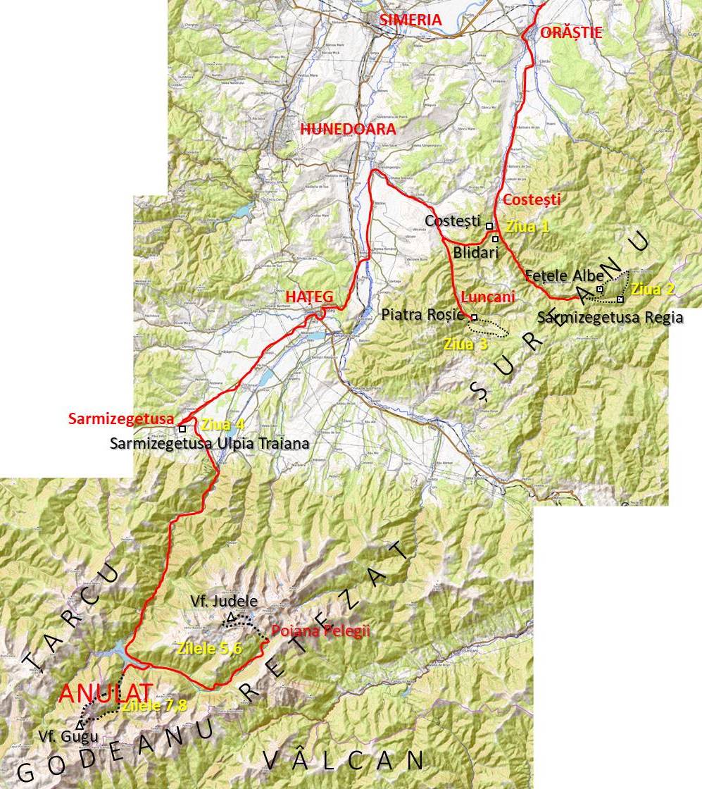 – traseu auto: Valea Roșie – HAȚEG – SARMIZEGETUSA (Ulpia Traiana Sarmizegetusa) – Barajul Gura Apelor – Valea Lăpușnicul Mare – Poiana Peleaga – cca 110 km