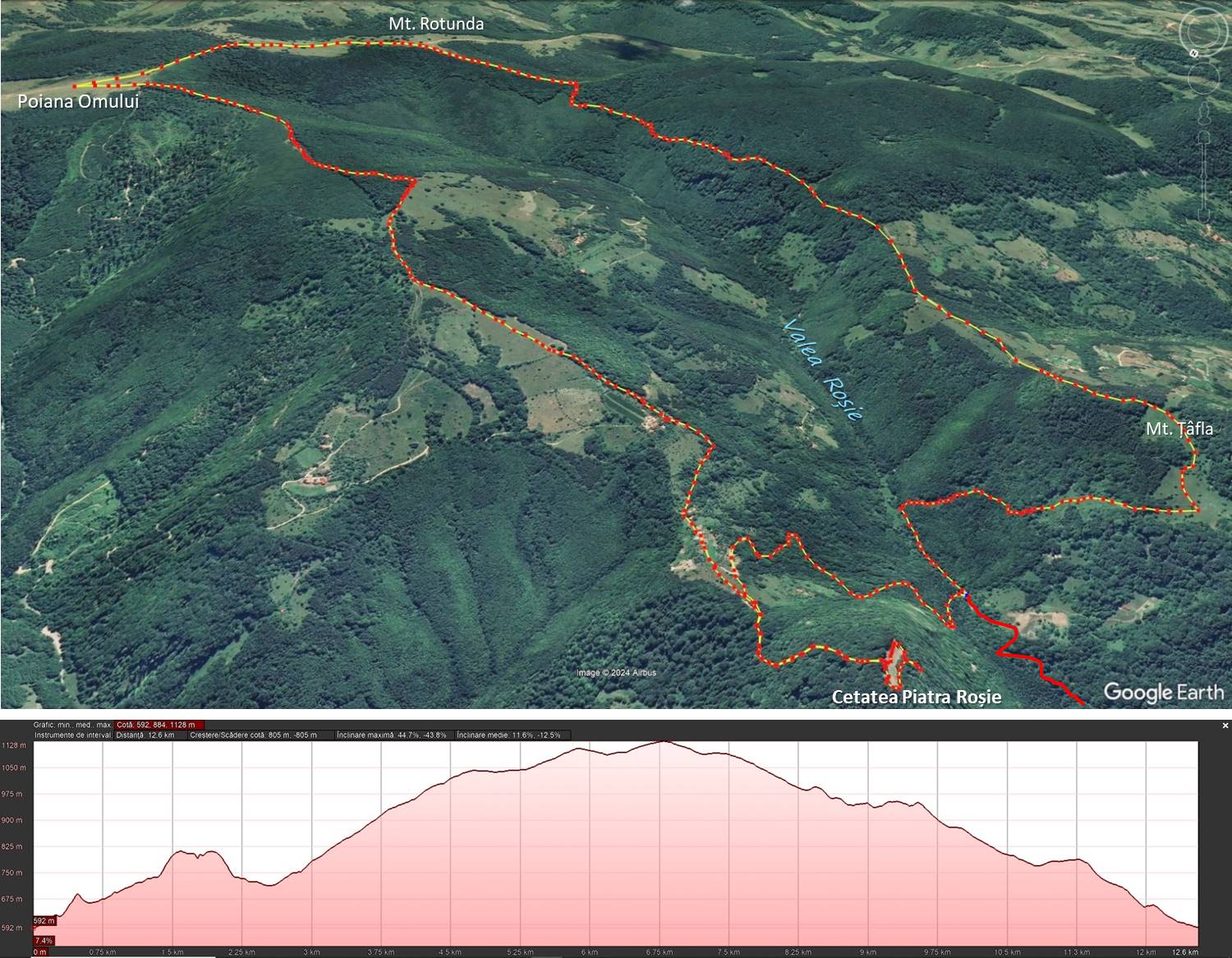 – traseu drumeție: Valea Roșie – Cetatea Pietrele Roșii – Poiana Omului – Mt. Rotunda – Mt. Țâfla – Valea Roșie