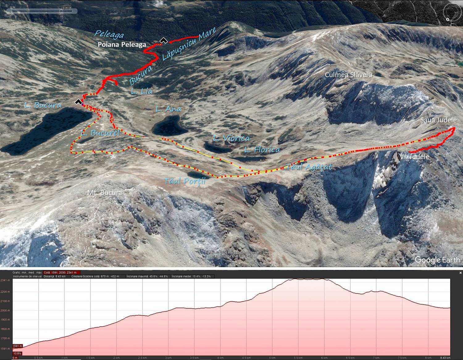 – traseu drumeție: Poiana Peleaga – Valea Bucura – Lacul Lia – Lacul Bucura – Lacurile Ana, Viorica Florica – Tăul Agățat – Șaua Judele – Vf. Judele – Șaua Judele – Tăul Agățat – Tăul Porții – Lacul Bucurel – Lacul Bucura