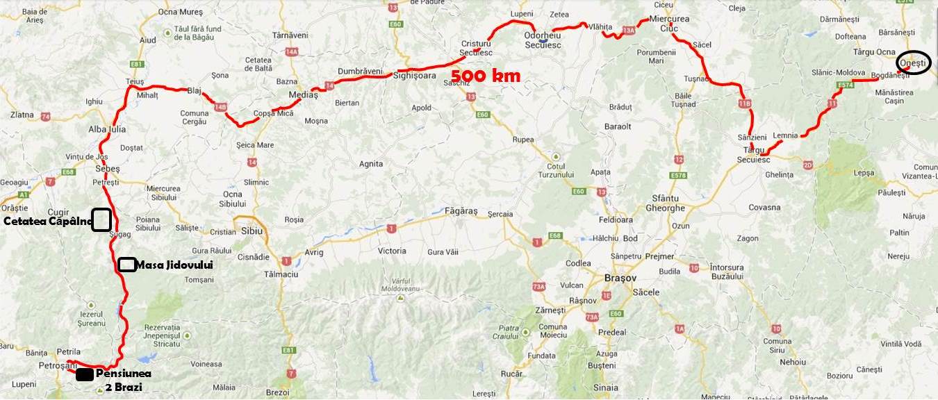 1. duminică, 28 iulie 2013: Oneşti – Brașov – Făgăraș – Râmnicu-Vâlcea – Novaci – Obârșia Lotrului – Petroșani (Zona Rusu) (plecare Oneşti, ora 5.00; sosire Petroșani, ora 18.30; cca 500 km)