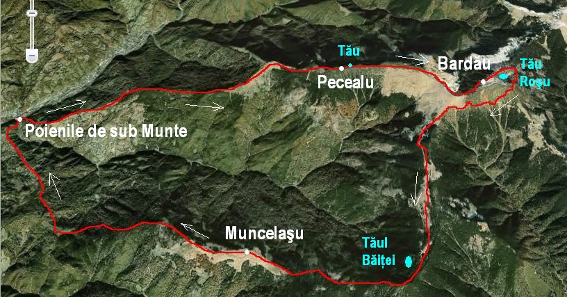 traseul 4: Borşa – Poienile de sub Munte (deplasare auto, cca 55 km); Poienile de sub Munte – Culmea Coşnea – Vf. Pecealu – Vf. Bardău – Tăul Roşu – Tăul Băiţei –