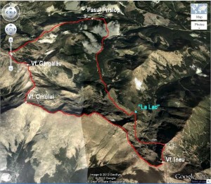 valea Prislopului – valea Putreda – Piciorul Tomnatecului (<La Tău>) – căldarea Bâlei – Vf. Ineu – Coasta Neteda – Vf. Omului –