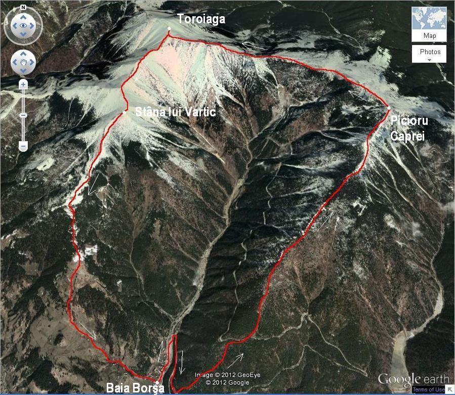 traseul 3: Borşa – Baia Borşa (deplasare auto, cca 8 km); Baia Borşa – Piciorul Caprei – Vf. Toroioaga – Vf. Stâna lui Vartic – Baia Borşa (cca 10 ore)