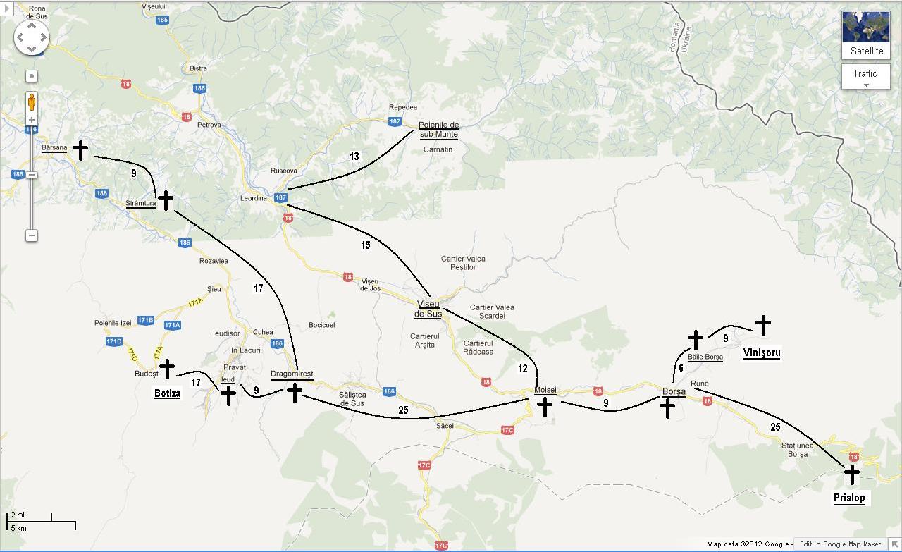 e) – excursie la Mânăstirile Dragomireşti, Botiza şi Ieud: acces auto (cca 50 km)