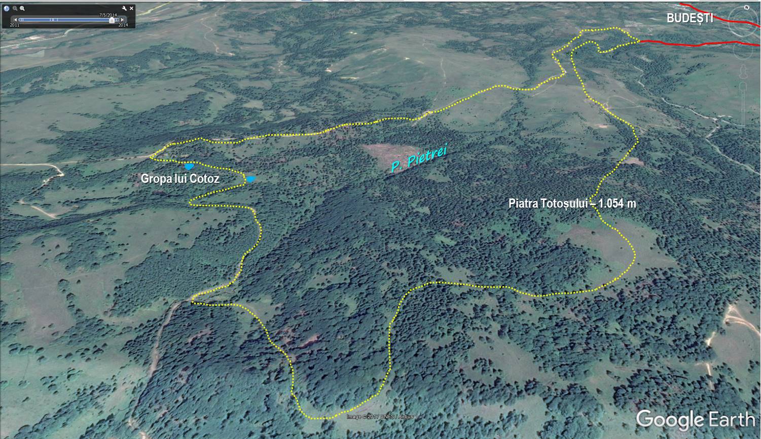 Traseu: Budești – Valea Sâva (cca 4 km auto) – Groapa lui Cotoz – Valea Pietrei – Piatra lui Tototș – Valea Sâva