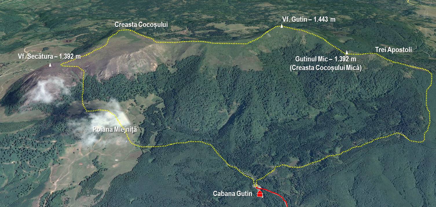 Traseu: Budești – Cabana Gutin (cca 25 km) – Trei Apostoli – Gutinul Mic – Vf. Gutin – Creasta Cocoșului – Vf. Secătura – Hornul Mic – Poiana Mlejniță – Cabana Gutin