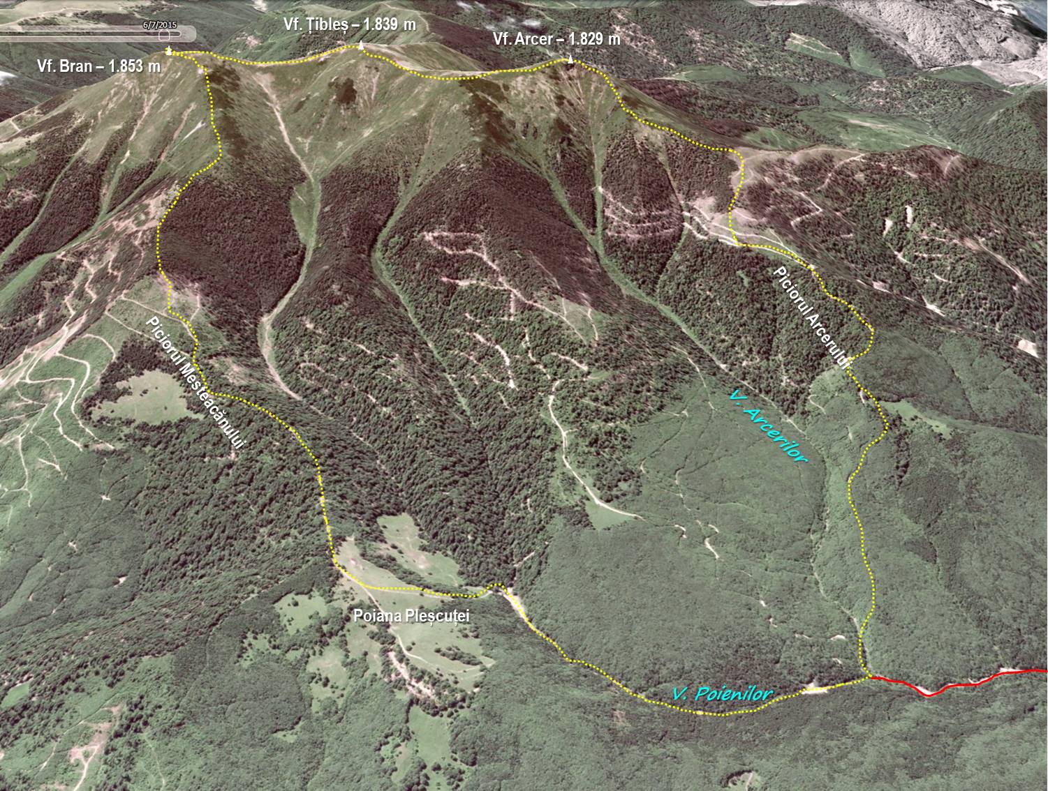 Traseu: Budești – Gura Arcerului (Valea Poienilor/Dragomirești) (cca 57 km) – Piciorul Arcerului – Vf. Arcer – Vf. Țibleș – Vf. Bran – Piciorul Mesteacănului – Poiana Pleșcuței – Valea Poienilor – Gura Arcerului