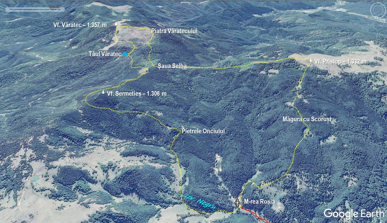 Traseu: Budești – M-rea Roșia (cca 7 km) – Măgura cu Scoruși – Vf. Prislop – Șaua Selha – Vf. Văratec – Lacul Văratec – Mt. Sermetieș – Pietrele Onciului – M-rea Roșia