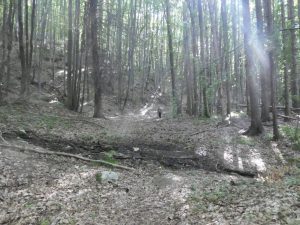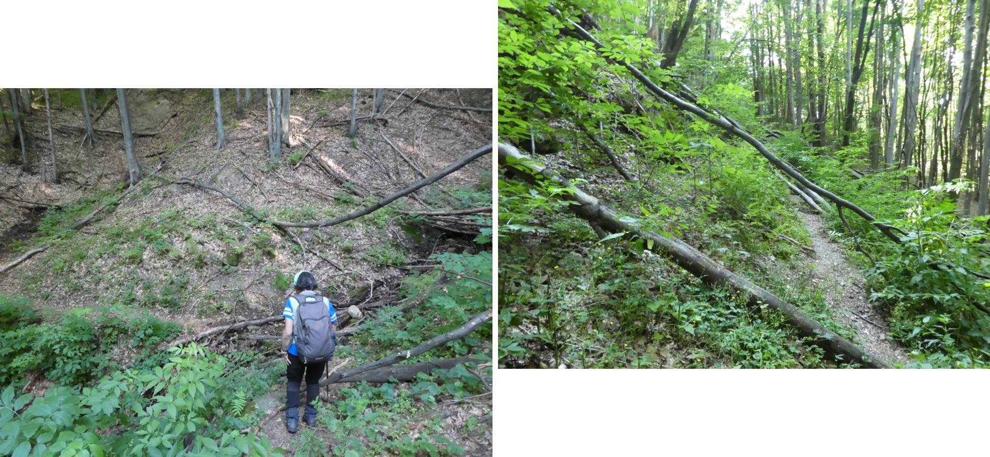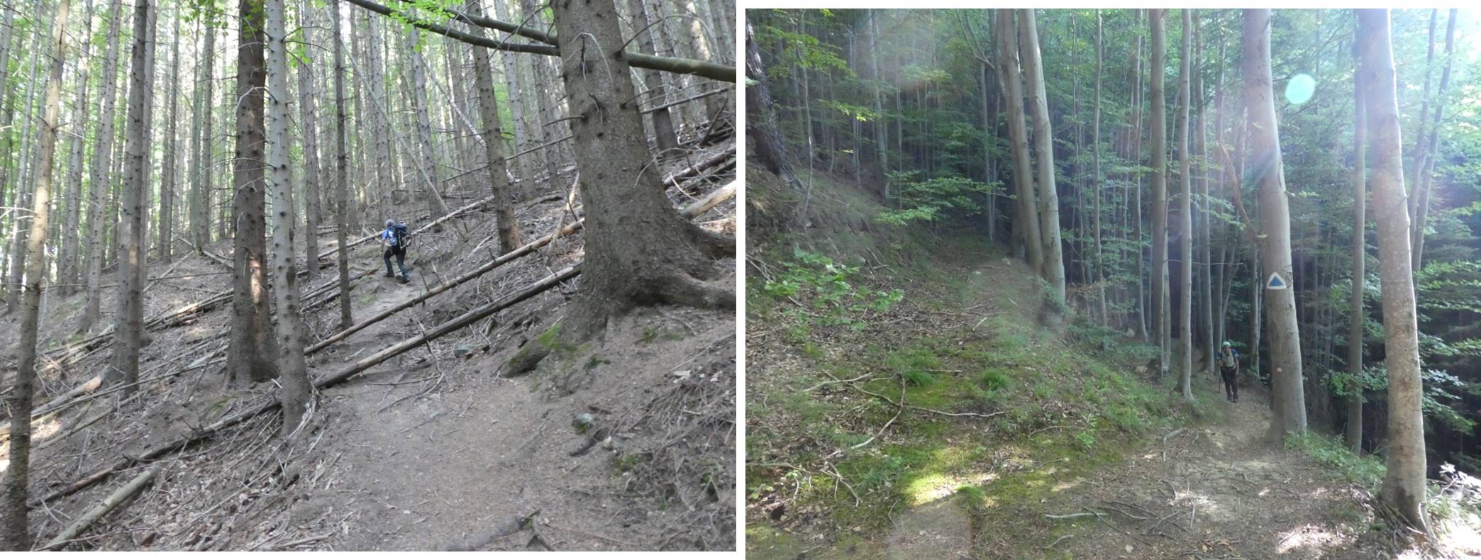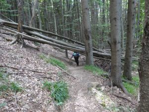 … trecem din pădurea de fag, prin care am mers de la început, într-o parcelă de molizi afectată de vijelii, dar nu în măsura în care să ne încurce foarte rău înaintarea.