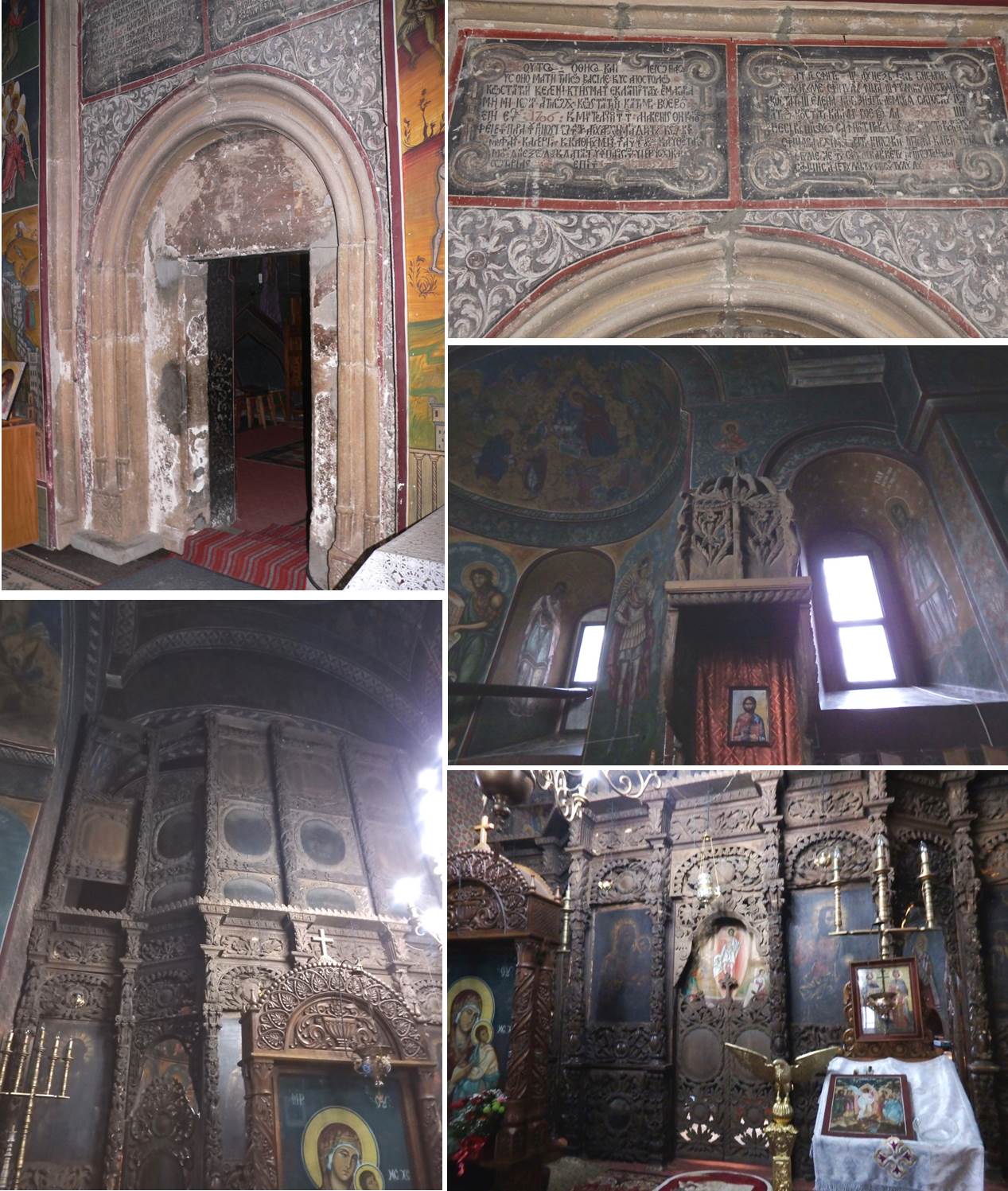 Interiorul impresionează prin distribuția volumelor și prin … volumetrie. Pisania este scrisă în două limbi, greacă și slavonă. Iconostasul, din lemn de tei, este singurul odor rămas după desființarea mînăstirii, în urma secularizării din 1863.