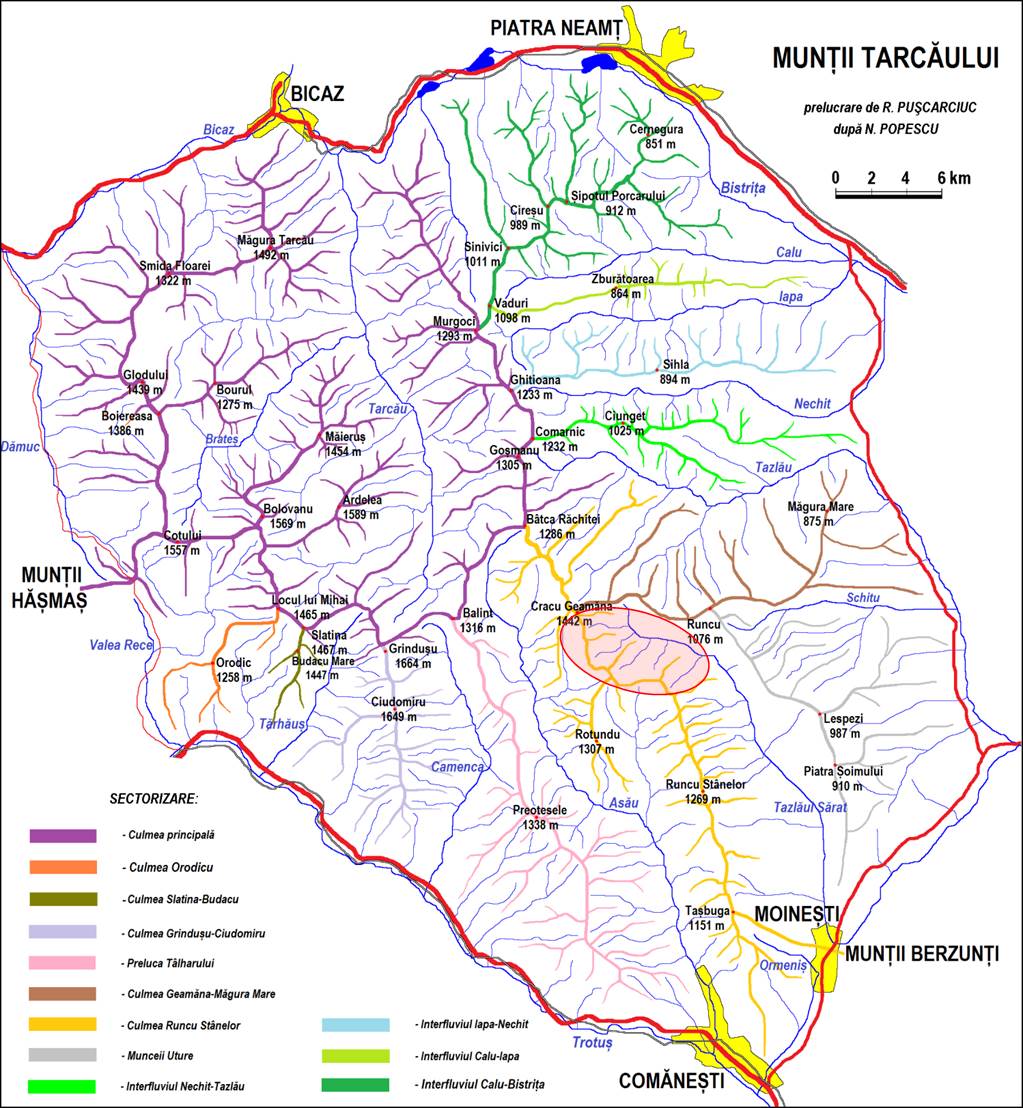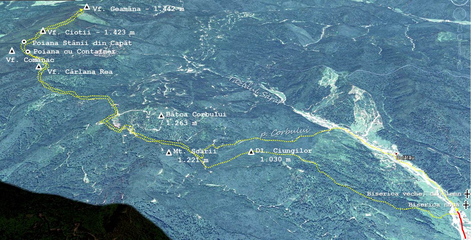 Traseu: Bolătău (Biserica nouă) – Dealul Ciungilor – Muntele Scării – Mt. Bâtca Corbului – Mt. Cârlana Rea – Poiana cu Container – Mt. Comănac – Poiana Stânei din Capăt – Mt. Ciotii – Vf. Holmul Arșiței – Vf. Geamăna – Vf. Holmul Arșiței – Mt. Ciotii – Poiana Stânei din Capăt – Poiana cu Container – Mt. Cârlana Rea – Mt. Bâtca Corbului – Valea Corbului – Bolătău – Biserica nouă