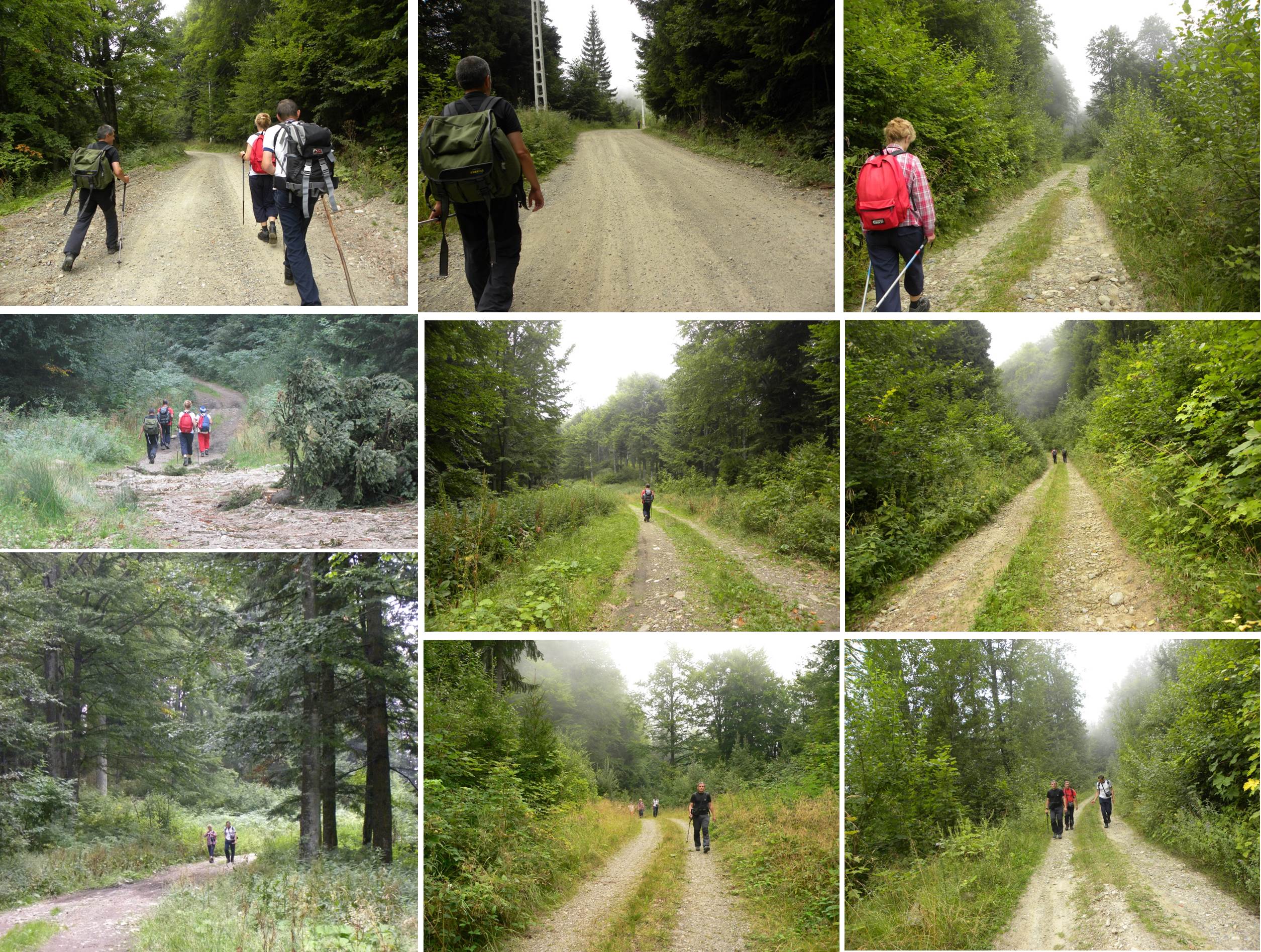 Vaga potecă, însoțită de marcajul silvic (benzi roșii, verticale), suie lejer prin pădure …