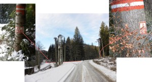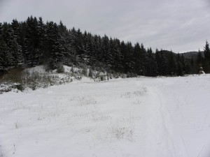 … suntem conduși de benzile roșii ale marcajului silvic, până ieșim la troița de sub Vârful Cărlana Rea !