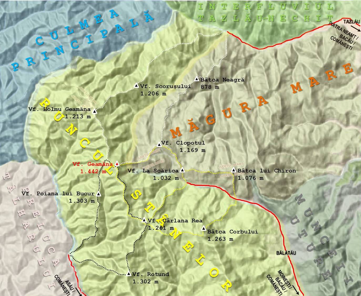 Vârful Geamăna – 1.442 m – reprezintă un important nod orografic al Culmii Runcu Stânelor -, din care se desprind două puternice brațe laterale: Măgura Mare și Munceii Uture.