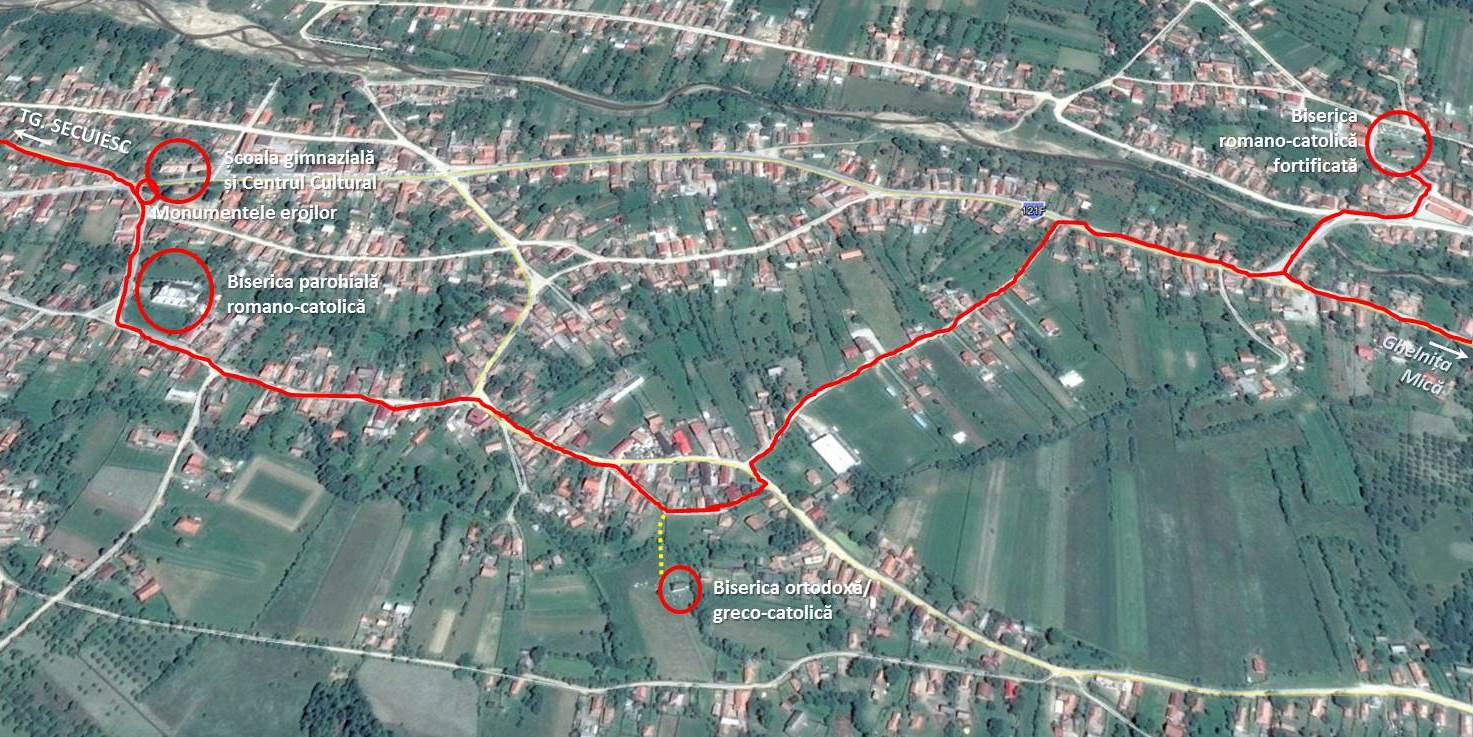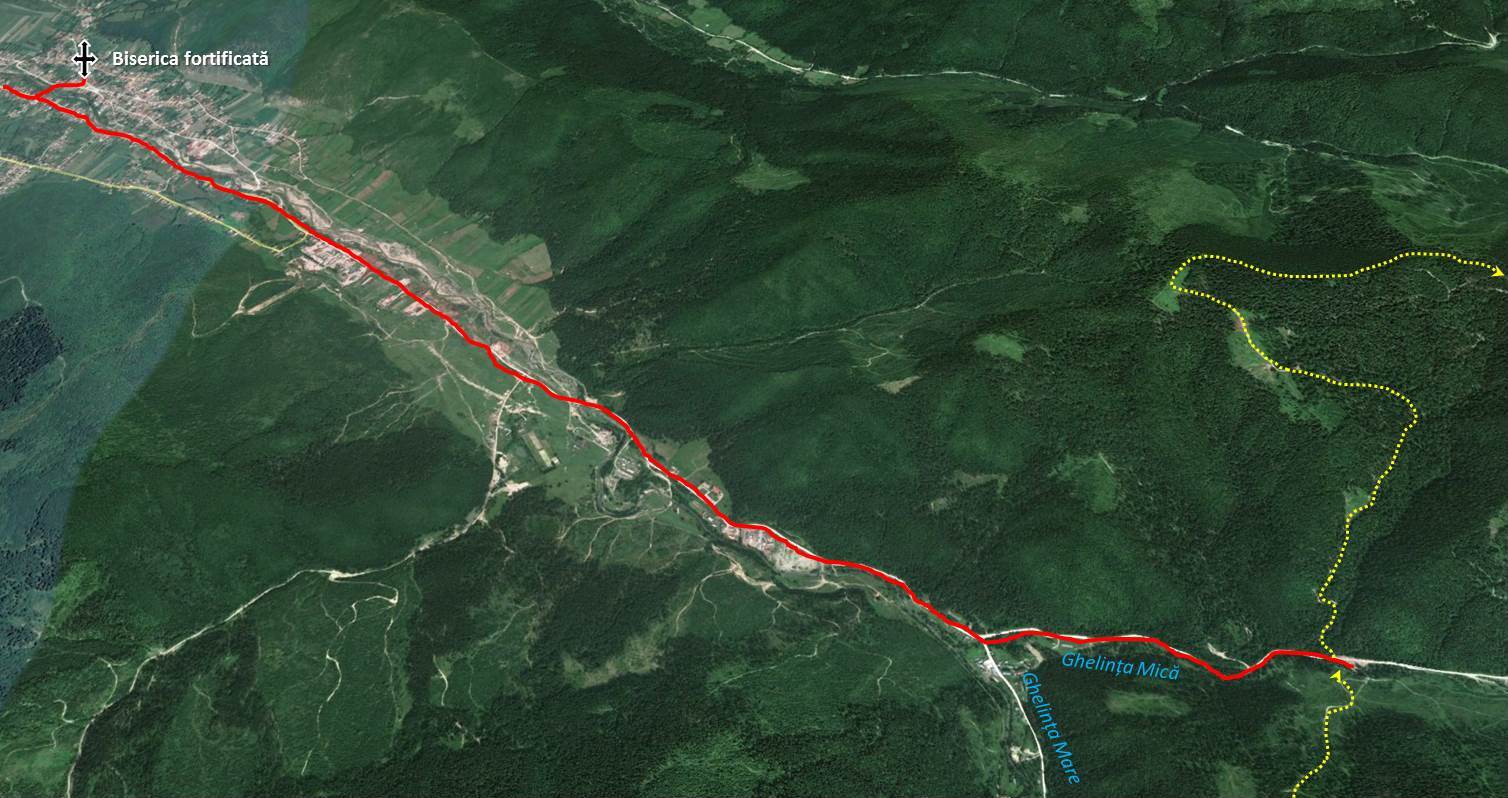 De la biserica fortificată până la confluența Ghelințelor drumul petrolier este când asfaltat, când betonat; pe Ghelința Mică suie un drum forestier în stare relativ bună.
