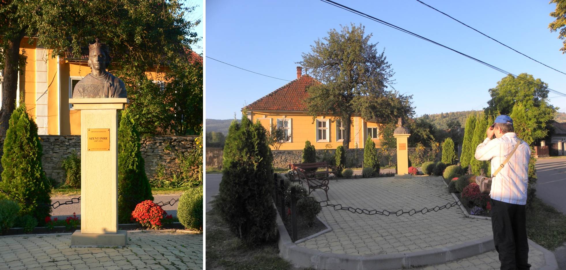În fața bisericii se poate vedea bustul Sf. Imre (Emeric). A fost fiul primului rege al Ungariei, Ștefan I (997-1031); n-a apucat să domnească căci a fost ucis de un mistreț la o vânătoare. Murind în același an cu tatăl său, a și fost caconizat odată cu acesta, în 1083, în timpul regenței Sf. László/Ladislau I, care i-a și promovat apoi cultul public; de pildă ar fi înființat o primă mânăstire sub patronajul Sf. Imre în pădurea Igfon de lângă la Sântimreul actual (BH) unde, zice-se, acesta ar fi murit (numele localității bihorene – ca și cel al Sântimbrului din Alba sau din Harghita – chiar provine de la cel al sfântului; despre mânăstire nu se mai știe nimic. Această politică … expansionistă privind cultul unor personalități e una continuă și … prezentă, chiar Sf. Imre fiind un exemplu: se consideră astfel, că însăși America venerează numele sfântului prin cel al său, considerându-se că prenumele Americo/Amerigo al italianului Vespucci ar proveni de la cel al sfântului; puțin probabil, căci italienii îi traduc numele în Emerico (chiar dacă portughezii îi zic Américo).
