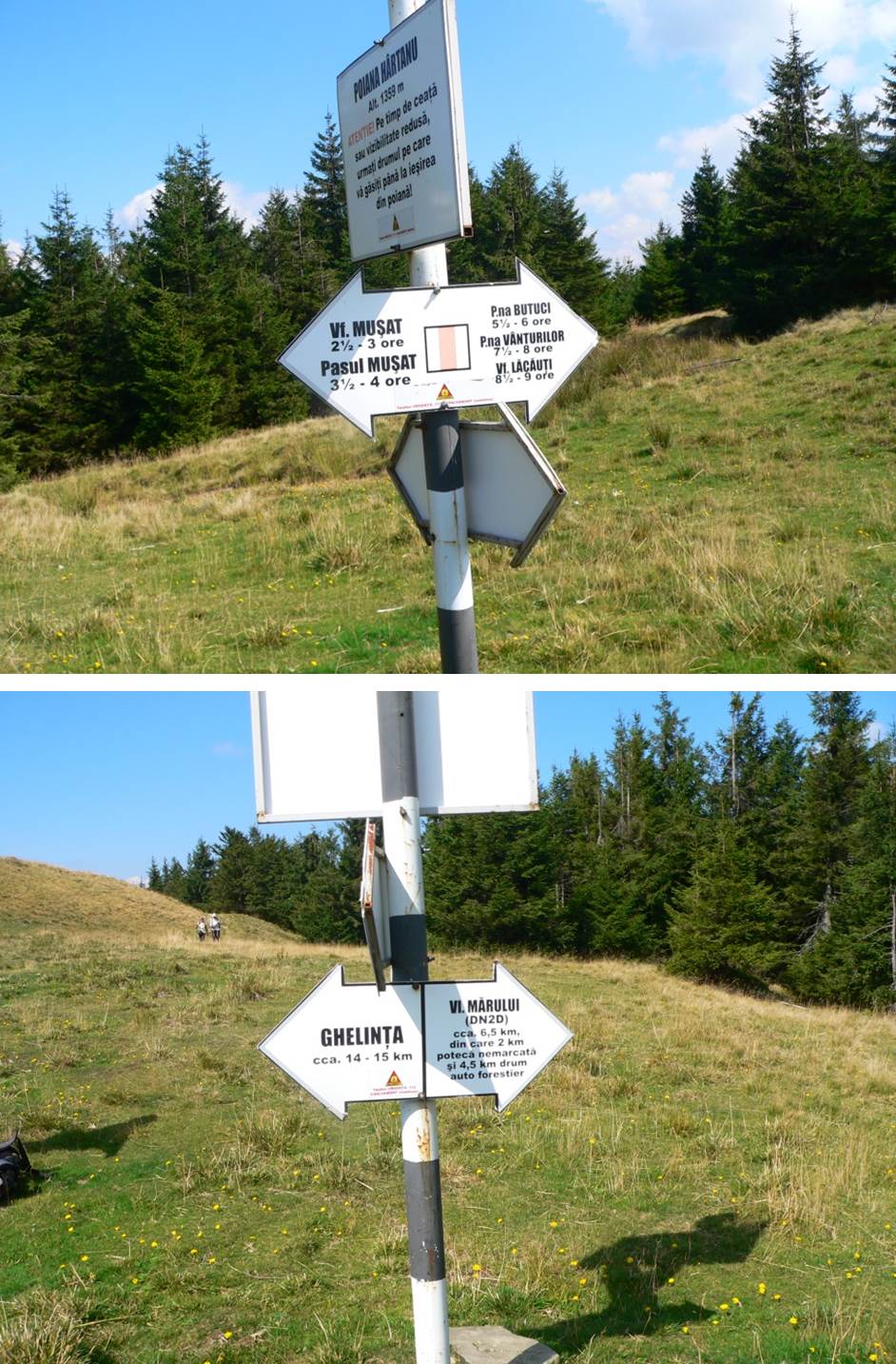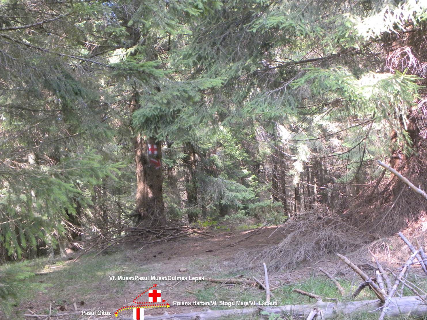 – “Crucea roșie” pe care am întâlnit-o sub Vf. Mușat, cea care, probabil, suie pe Vf. Mușat și coboară apoi La DN 2D în Șaua Mușat, nici măcar nu este consemnată (de altfel, venind spre Poiana Hartanu, am remarcat și dispariția semnelor în cauză);