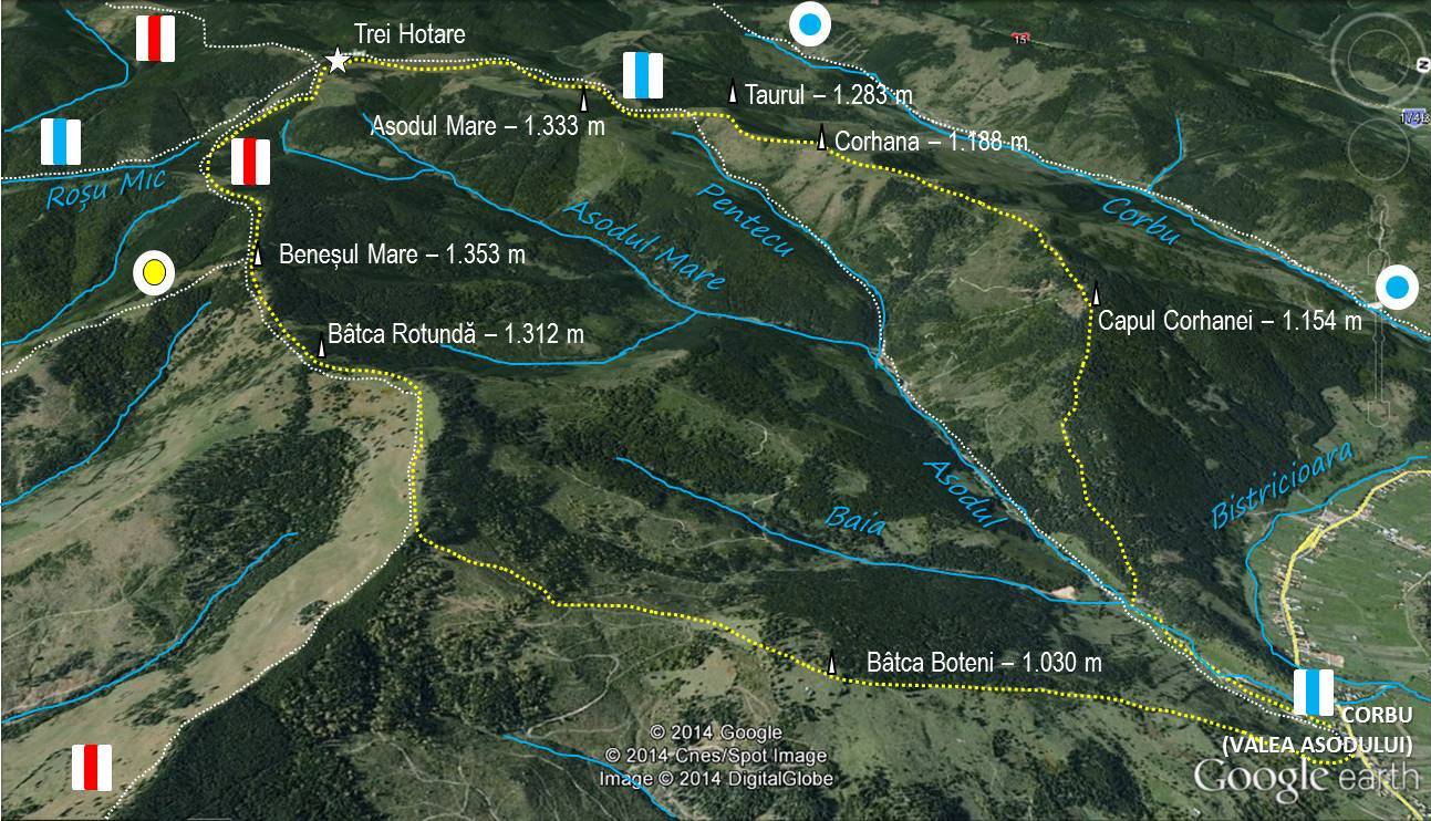 … pe nodul orografic ce desparte cele două bazine și fiecare dintre ele de bazinul Corbului (>Bistricioara), numit Trei Hotare !